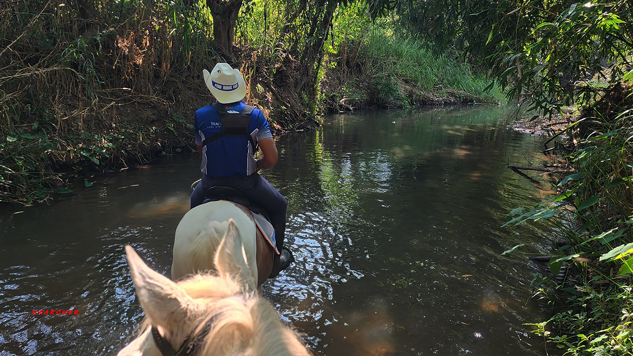騎馬途中,馬兒走進水溝,這裡是牠們補水的地方。騎乘時要保持耐心,輕輕握著韁繩,不要強力拉扯,讓牠們自在地停下來飲水,享受片刻的舒適。這樣的互動,讓人更能體會到與馬同行的節奏與默契。